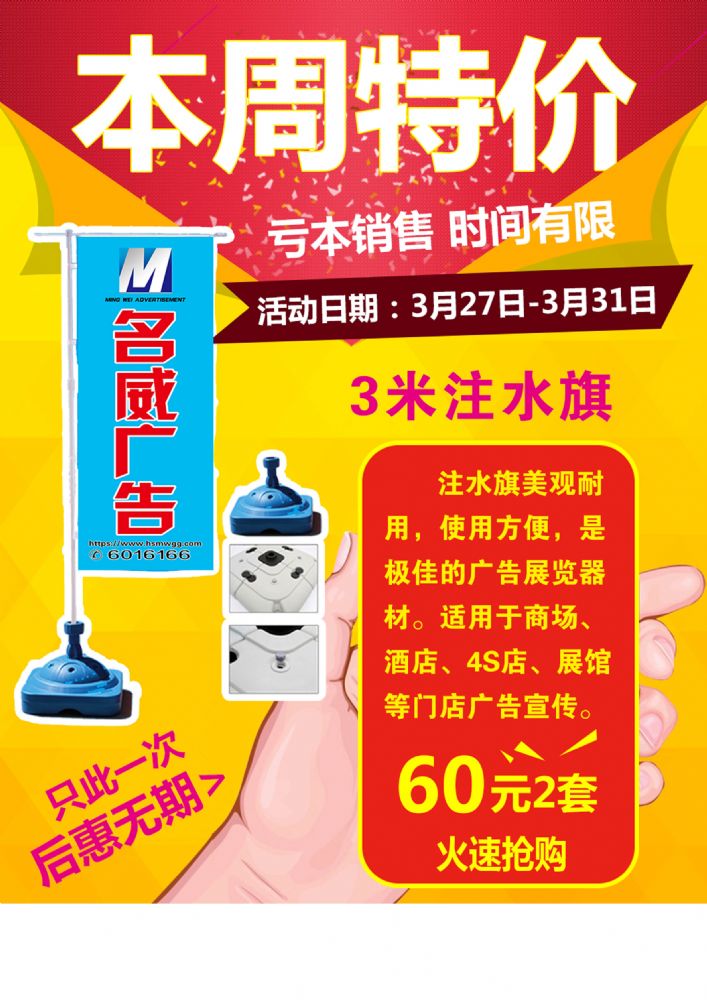 一言不合就特價 本周特價3米注水旗,限時特價60元/2套。